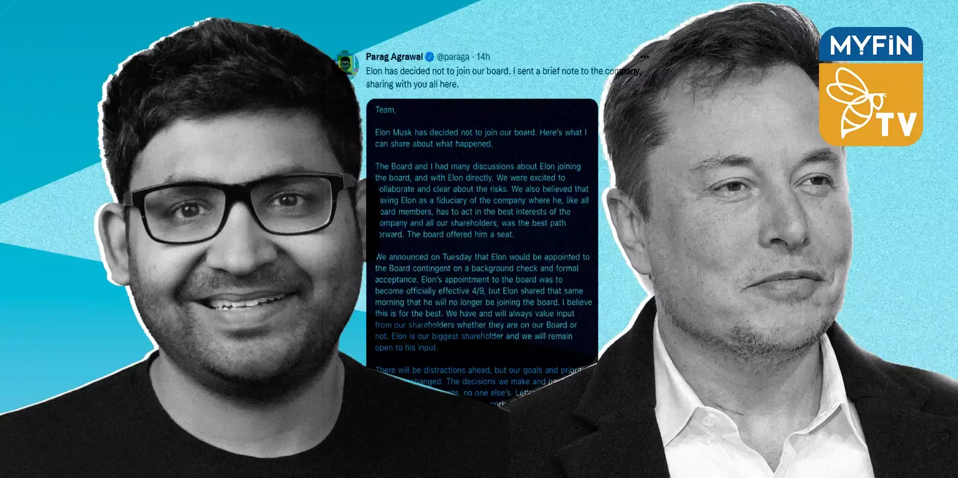 ഇലോൺ മസ്ക് ട്വിറ്റർ ബോർഡിൽ ചേരുന്നില്ലെന്ന് അറിയിച്ചതായി ട്വിറ്റർ സിഇഒ പരാഗ് അഗർവാൾ അറിയിച്ചു. ട്വീറ്റിലൂടെയാണ് പരാഗ് അഗർവാൾ ഇക്കാര്യം അറിയിച്ചത്.
