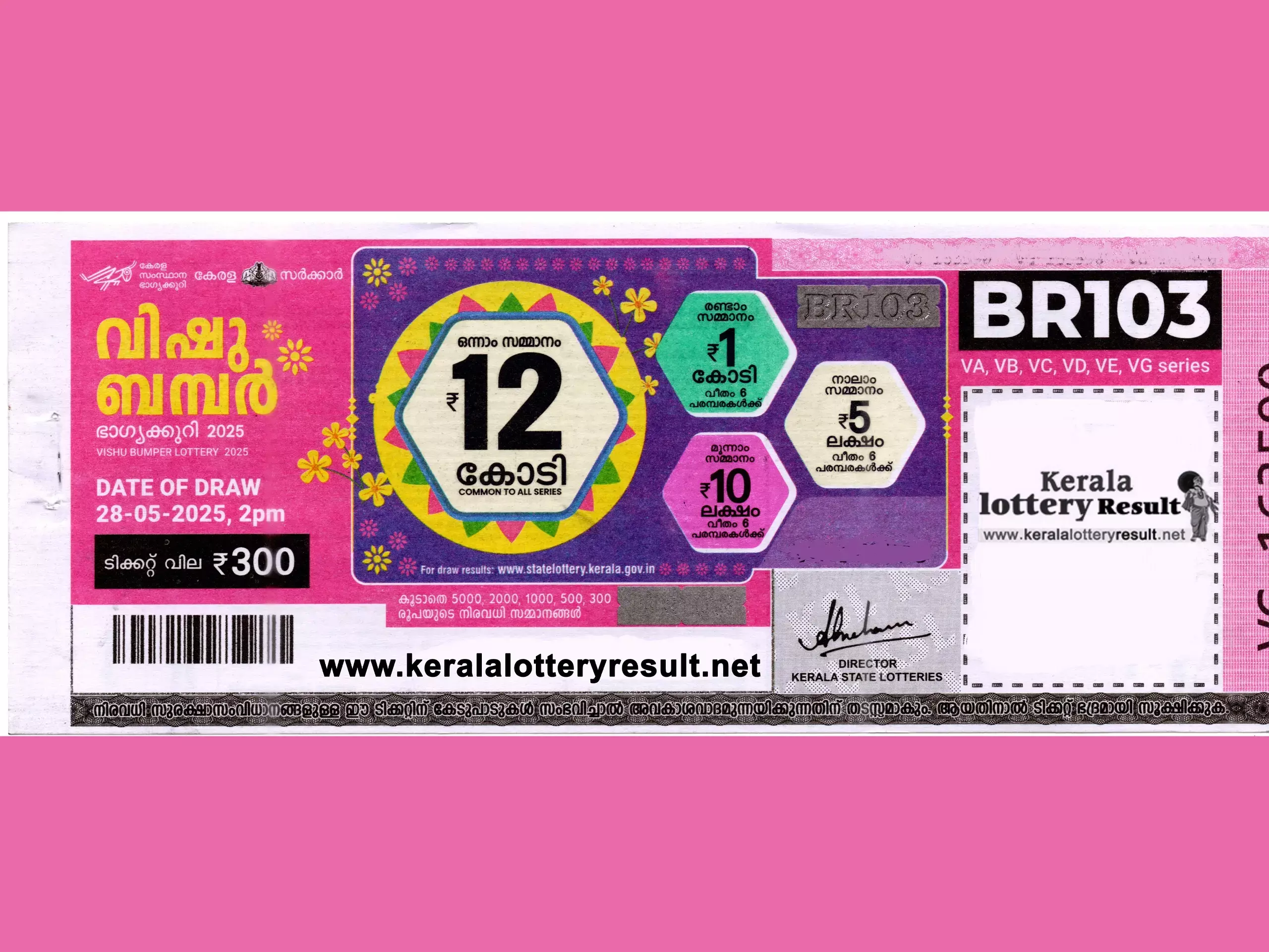 12 കോടി രൂപ ഒന്നാം സമ്മാനം നൽകുന്ന സംസ്ഥാന സർക്കാർ വിഷു ബമ്പർ (ബി ആർ - 103) ഭാഗ്യക്കുറിയുടെ നറുക്കെടുപ്പ് 28 ന് ഉച്ചയ്ക്ക് 2 ന് നടക്കും. വില്പനയ്ക്കായി വിപണിയിൽ എത്തിച്ച 45 ലക്ഷം ടിക്കറ്റുകളിൽ തിങ്കളാഴ്ച നാലു മണിക്കുള്ളിൽ 42,17,380 ടിക്കറ്റുകളും വിറ്റു പോയിട്ടുണ്ട്. 300 രൂപ വില്പന വിലയുള്ള വിഷു ബമ്പർ ടിക്കറ്റുകൾ മൊത്തം ആറു പരമ്പരകളിലായാണ് വിപണിയിൽ എത്തിയത്.