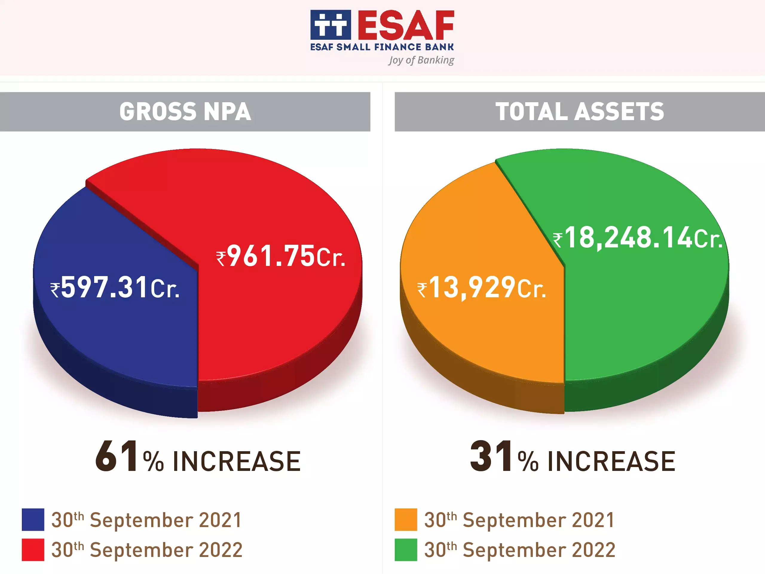 വാർഷികാടിസ്ഥാനത്തിൽ, ബാങ്കിന്റെ മൊത്ത നിഷ്ക്രിയ ആസ്തി (എൻപിഎ) അല്ലെങ്കിൽ കിട്ടാക്കടം വോളിയം അടിസ്ഥാനത്തിൽ 61 ശതമാനം ഉയർന്ന് 597.31 കോടി രൂപയിൽ നിന്ന് 961.75 കോടി രൂപയായതായി കണക്കുകൾ വ്യക്തമാക്കുന്നു. അതായത്, കഴിഞ്ഞ ഒരു വർഷത്തിനിടെ മൊത്ത എൻപിഎ 6.31 ശതമാനത്തിൽ നിന്ന് 8.11 ശതമാനമായി ഉയർന്നപ്പോൾ, അറ്റ എൻപിഎ 2.13 ശതമാനത്തിൽ നിന്ന് 4.34 ശതമാനമായി ഇരട്ടിച്ചു. രാജ്യത്തെ സ്വകാര്യമേഖലാ ബാങ്കുകളുമായി താരതമ്യം ചെയ്യുമ്പോൾ ഇത് ഏറ്റവും ഉയർന്ന അനുപാതങ്ങളിലൊന്നാണ്.