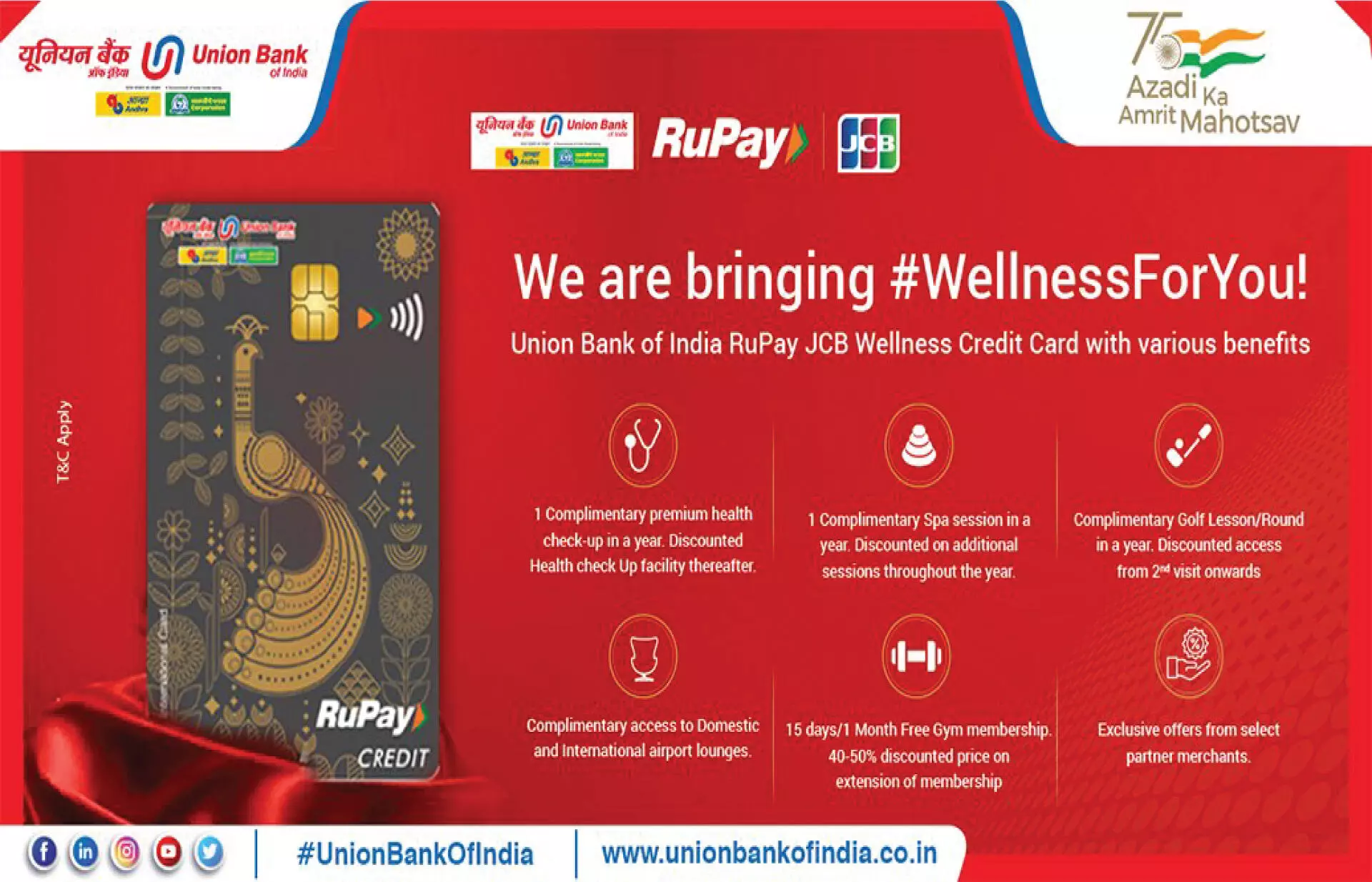 യൂണിയന് ബാങ്ക് റൂപേ വെല്നസ് ക്രെഡിറ്റ് കാര്ഡ് ഉപയോഗിക്കുന്നവര്ക്ക് രാജ്യത്തെ 100 സ്പാ ഔട്ട്ലെറ്റുകളില് സൗജന്യ പ്രവേശനം നേടാം. മാസത്തില് ഒന്ന് എന്ന തരത്തിലാണ് ഇത്. വര്ഷത്തില് ഒരിക്കല് വെല്നസ് ട്രീറ്റ്മെന്റിനുള്ള സൗകര്യവുമുണ്ടാകും. വര്ക്ക് ഔട്ട് സംവിധാനങ്ങളും ഈ കാര്ഡിന്റെ പരിധിയില് പെടുത്തിയിട്ടുണ്ട്.