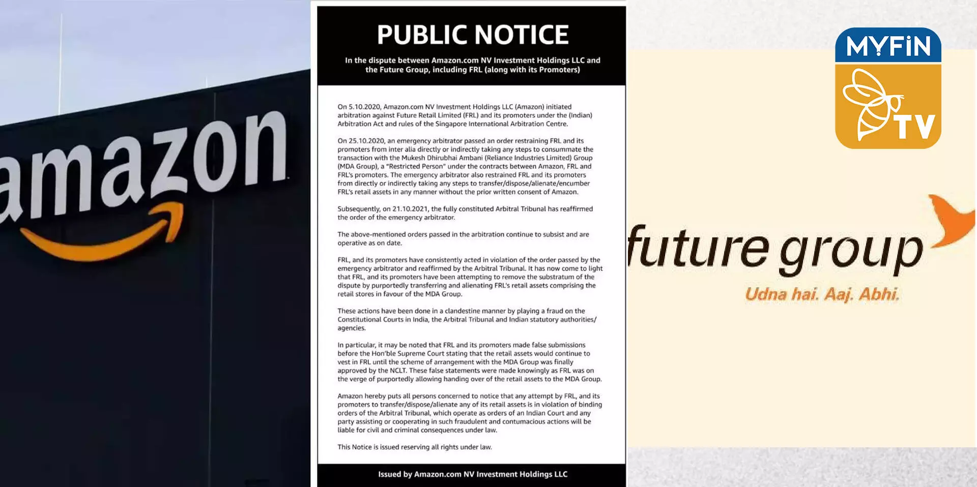 ഫ്യൂച്ചര്-റിലയന്സ് ഡീലിനെതിരെ പ്രമുഖ പത്രങ്ങളില് പബ്ലിക് നോട്ടീസ് എന്ന പേരില് പരസ്യം നല്കിയാണ് ആമസോണ് പ്രതിഷേധം അറിയിച്ചത്. ഏതെങ്കിലും തരത്തിലുള്ള ഇടപാടുകള് ഫ്യുച്ചര് റിറ്റൈല് ലിമിറ്റഡിന്റെ ഭാഗത്തുനിന്നും ഉണ്ടായാല് കടുത്ത നിയമ നടപടികള് നേരിടേണ്ടി വരുമെന്നായിരുന്നു പരസ്യത്തില്ആമസോണ് അറിയിച്ചത്.