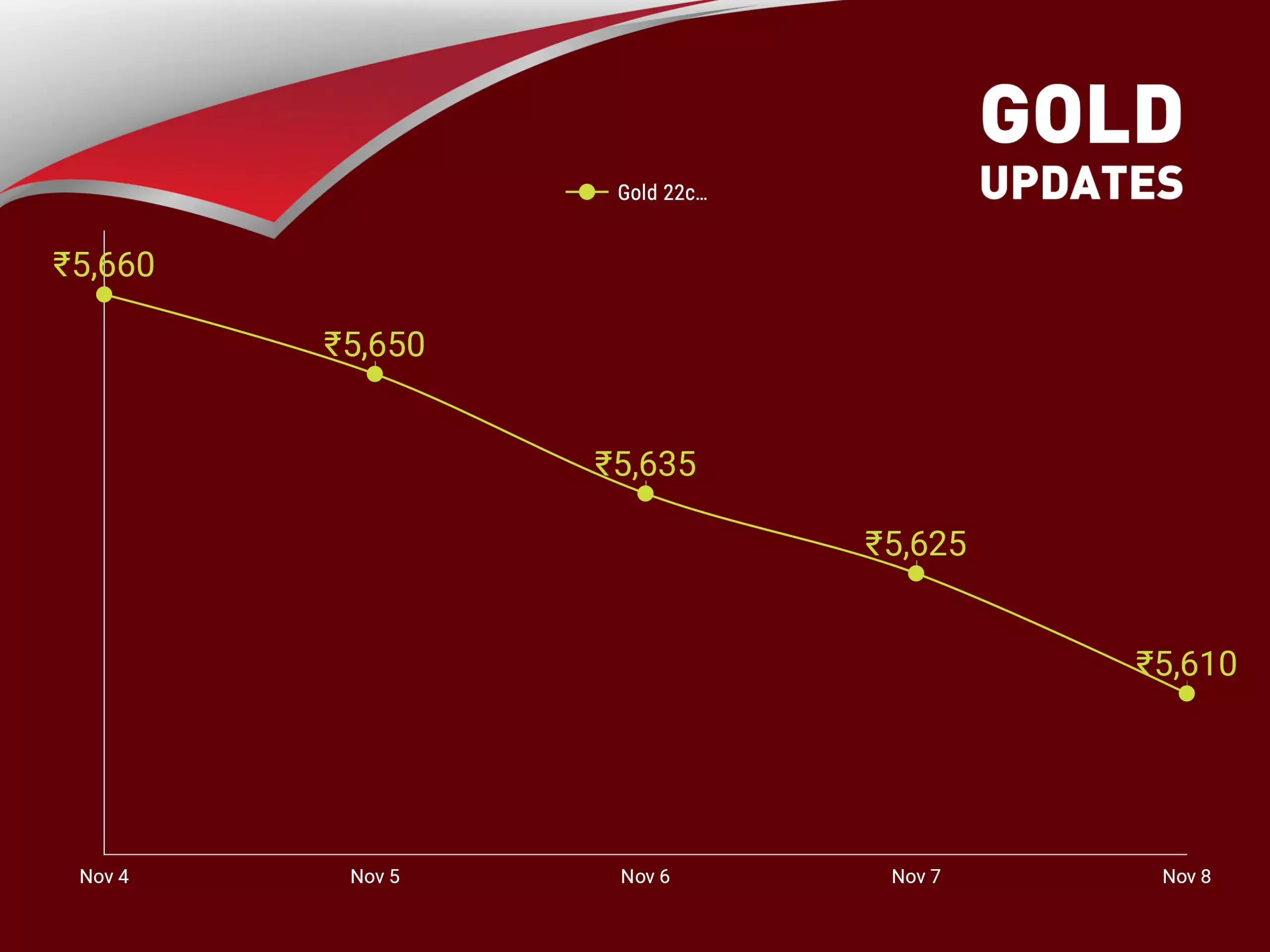 തുടര്ച്ചയായ നാലാം ദിനത്തിലും സംസ്ഥാനത്തെ സ്വര്ണ വില ഇടിഞ്ഞു. 22 കാരറ്റ് സ്വര്ണം ഗ്രാമിന് ഇന്ന് 15 രൂപ കുറഞ്ഞ് 5610 രൂപയായി, പവന് ഇന്ന് 120 രൂപ കുറഞ്ഞ് 44,880 രൂപയിലാണ് വ്യാപാരം നടക്കുന്നത്. നാലു ദിവസങ്ങളിലായി 400 രൂപയുടെ ഇടിവാണ് പവന് ഉണ്ടായിരിക്കുന്നത്. 24 കാരറ്റ് സ്വര്ണം ഗ്രാമിന് ഇന്ന് 16 രൂപ കുറഞ്ഞ് 6,120 രൂപയാണ്. പവന് 128 രൂപ കുറഞ്ഞ് 48,960 രൂപ.