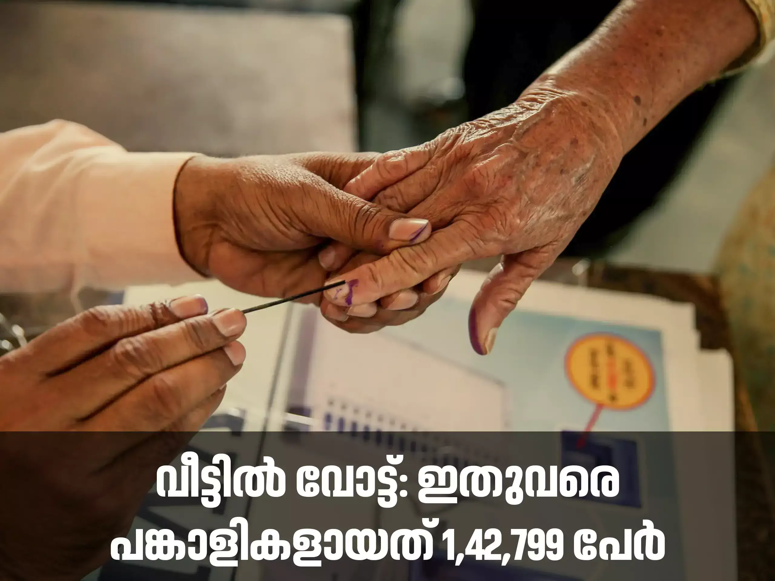 സംസ്ഥാനത്ത് ഇതുവരെ 1,42,799 പേർ വീട്ടിൽ വോട്ട് ചെയ്തു. 85 വയസ്സിൽ കൂടുതൽ പ്രായമുള്ള 1,02,285 പേരും ഭിന്നശേഷിക്കാരായ 40,514 പേരും ഇതിൽപ്പെടുന്നു.