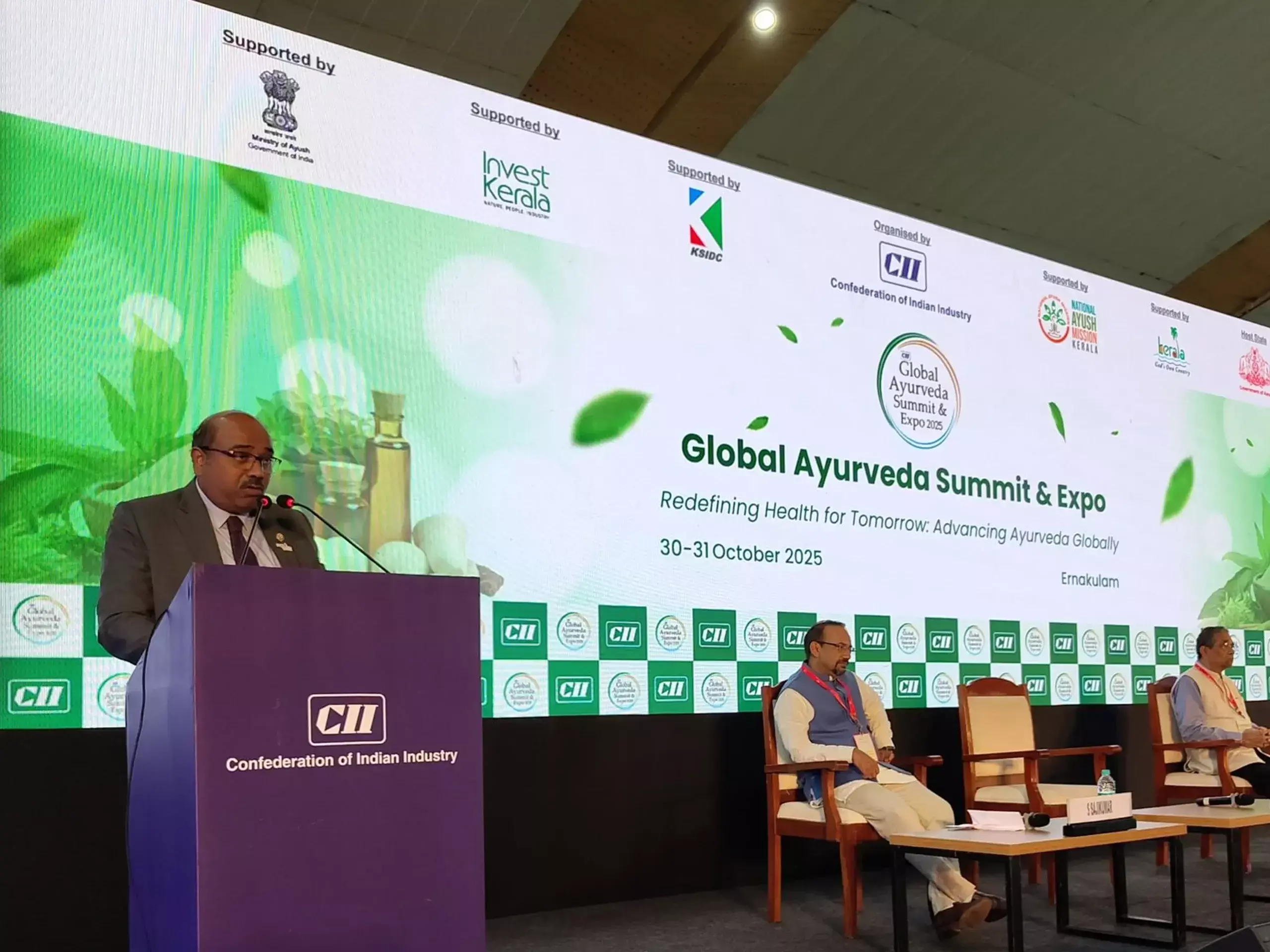 ആഗോള ആയുർവേദ ഉച്ചകോടിയും കേരള ഹെൽത്ത് ടൂറിസം 2025 ന്റെയും സമാപന സമ്മേളനം കെ ശരവണ കുമാർ ഉദഘാടനം ചെയ്യുന്നു . ഡോ. സജി കുമാർ , ചെയർമാൻ, ഗ്ലോബൽ ആയുർവേദ സമ്മിറ്റ്, ഡോ. പി. എം. വാരിയർ, കൺവീനർ, സിഐഐ കേരള ഹെൽത്ത് കെയർ പാനൽ എന്നിവർ വേദിയിൽ