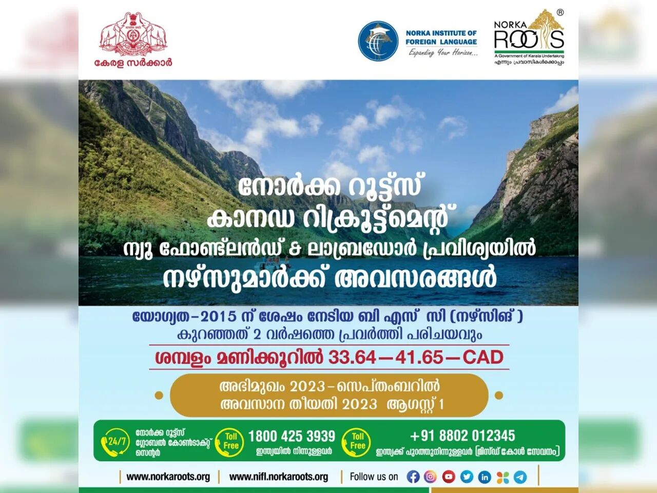 കേരളത്തിൽ നിന്നുള്ള നഴ്സുമാർക്ക് കാനഡയിലെ ന്യൂ ഫോണ്ട്ലൻഡ് & ലാബ്രഡോർ പ്രവിശ്യയിൽ തൊഴിൽ അവസരമൊരുക്കുന്ന നോർക്ക റൂട്ട്സ് റിക്രൂട്ട്മെന്റിലേയ്ക്ക് ഇപ്പോൾ അപേക്ഷിക്കാം. കേന്ദ്ര സർക്കാറിന്റെ അനുമതിയോടെ കേരള സർക്കാരും ന്യൂ ഫോണ്ട്ലൻഡ് & ലാബ്രഡോർ പ്രവിശ്യാ സർക്കാറും ഇതിനായുളള കരാർ കഴിഞ്ഞമാസം ഒപ്പിട്ടിരുന്നു. നഴ്സിങിൽ ബിരുദവും രണ്ട് വർഷത്തെ പ്രവർത്തി പരിചയവും ഉള്ള രജിസ്റ്റേർഡ് നഴ്സുമാർക്കാണ് അവസരം.